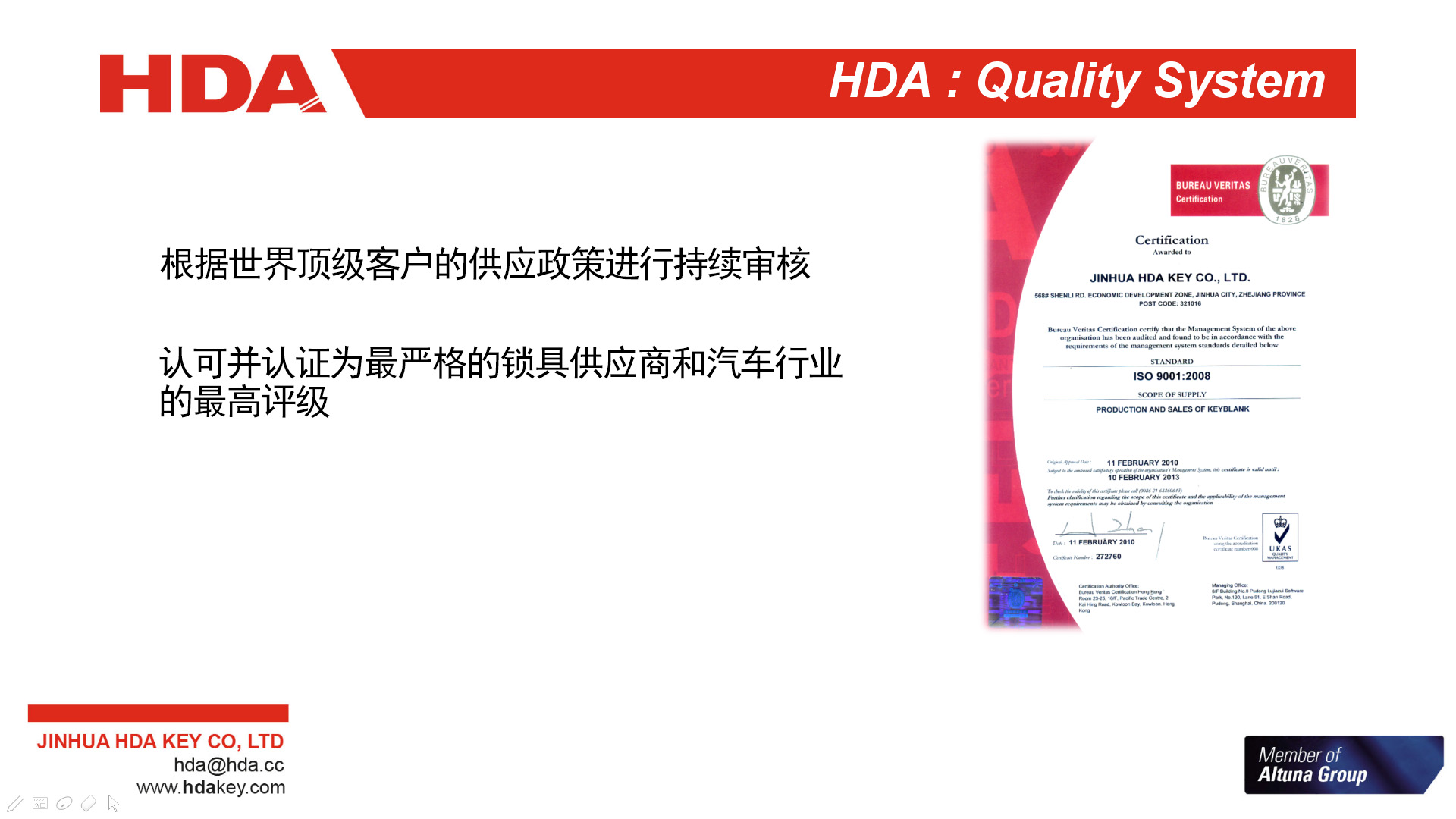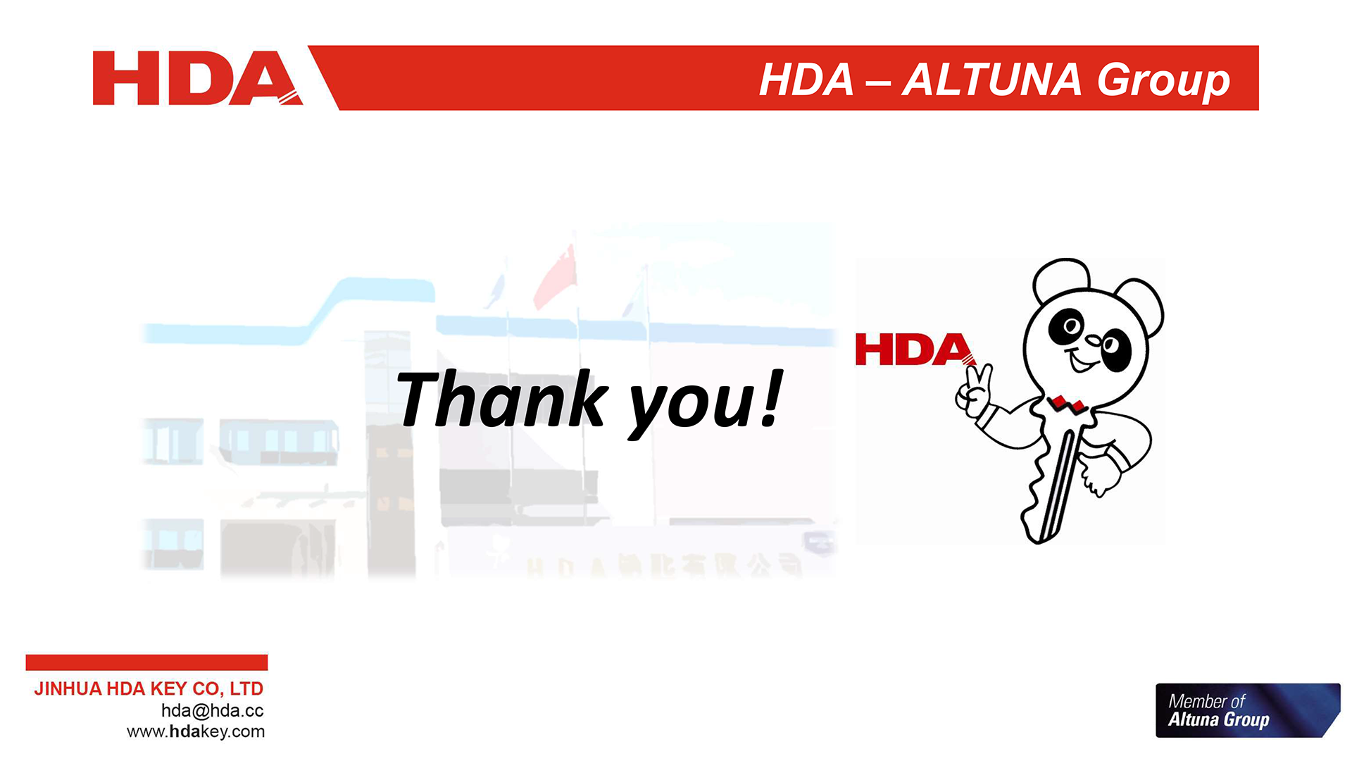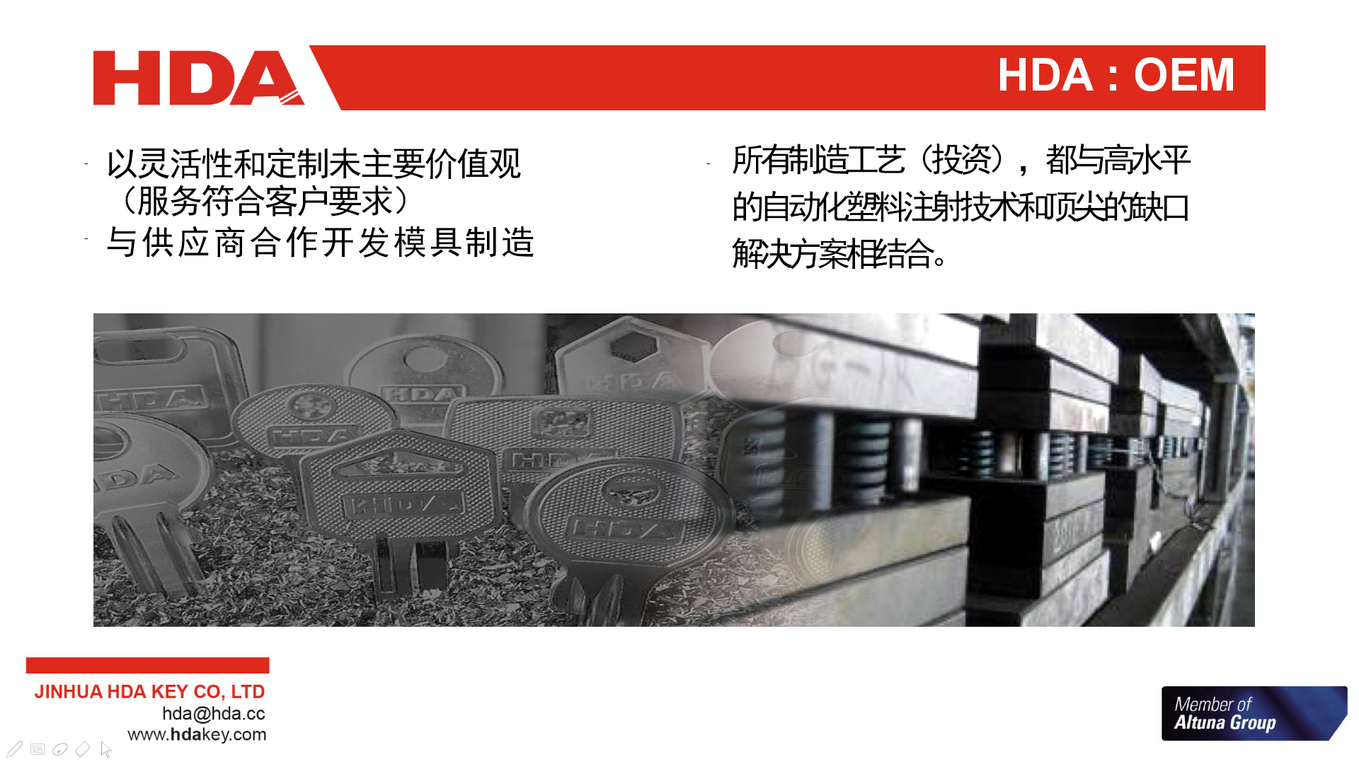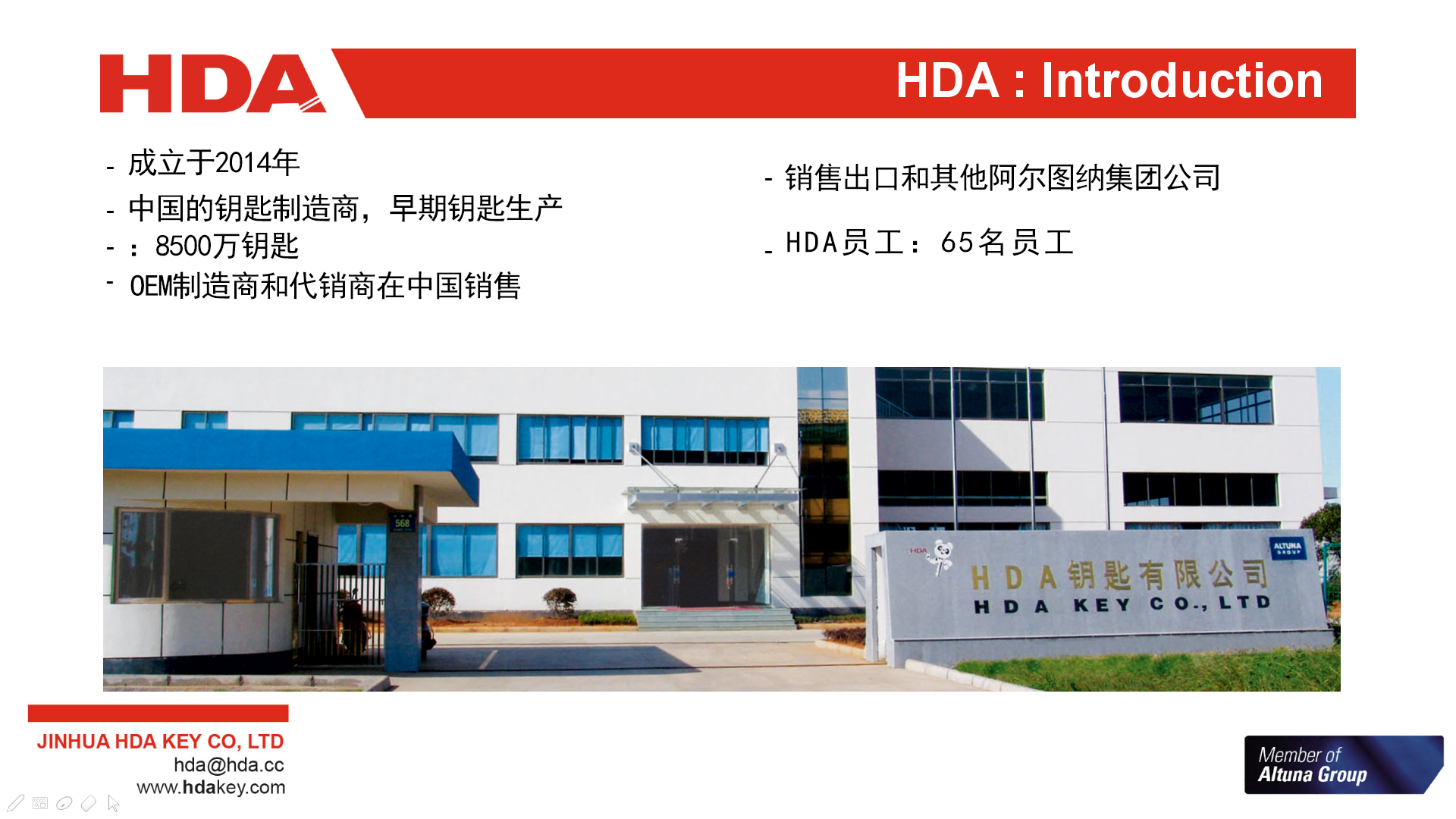 金華宏達鑰匙有限公司(簡稱HDA)位于浙江省金華市經濟開發區。工廠距離上海2小時高鐵車程,毗鄰的義烏小商品城。自90年代初建立以來,HDA已擁有二十多年生產和開發鑰匙的經驗。HDA是一家擁有上萬種原版產品的專業廠家,年產能約兩億條...